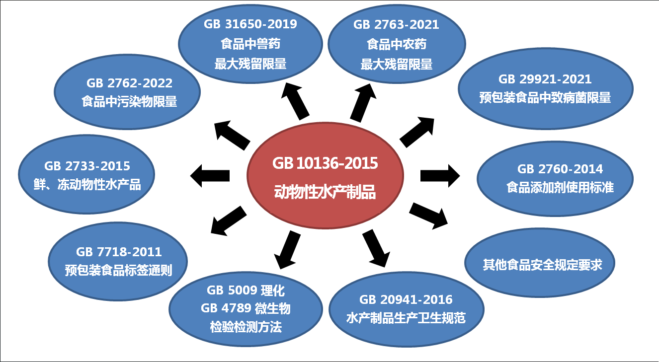 下图所示内容就体现了体系中各标准的有机衔接、相辅相成。针对动物性水产制品,有《食品安全国家标准 动物性水产制品1》(GB 10136-20152)。